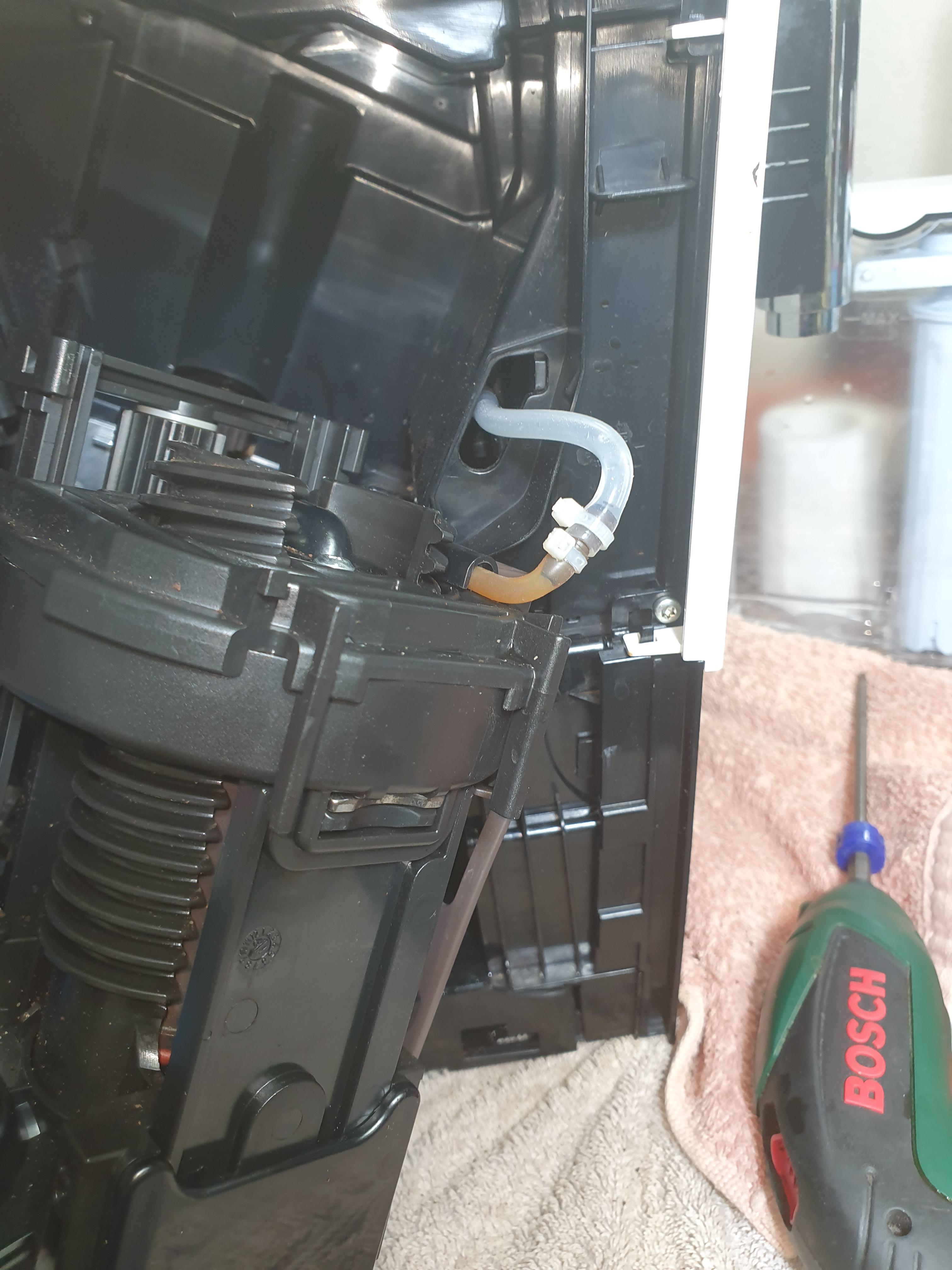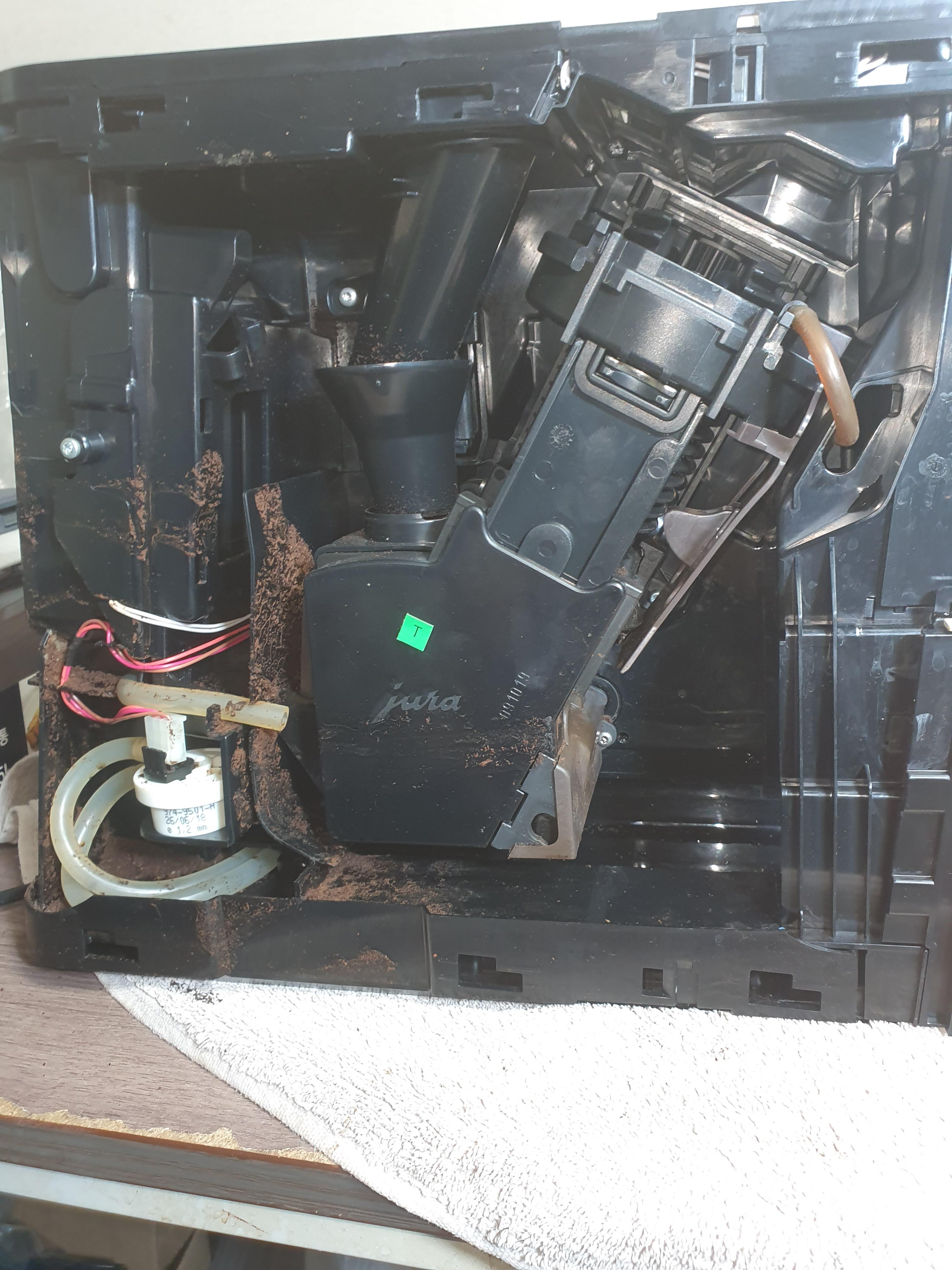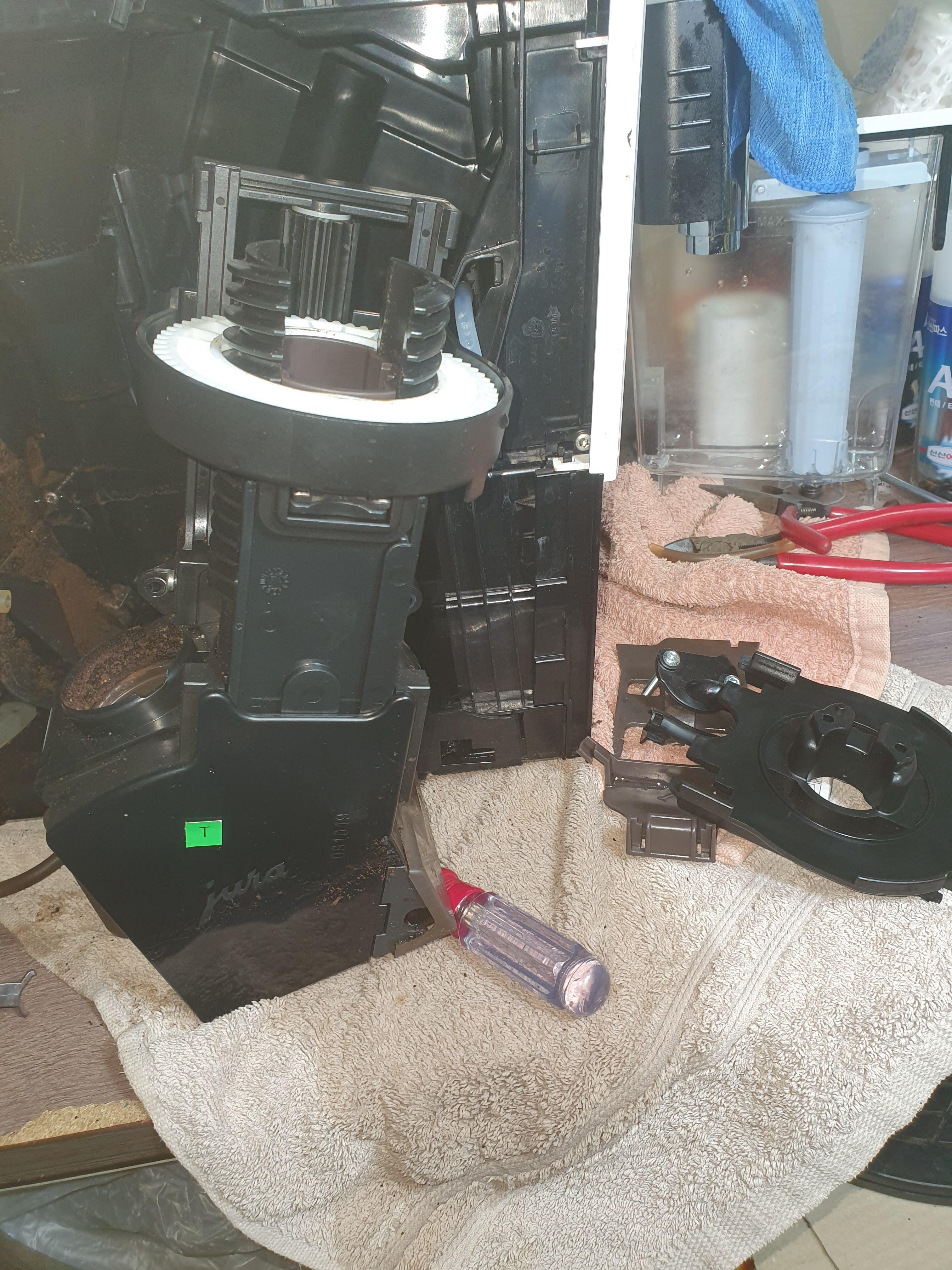 #금호동유라커피머신 사용자 제품.일반적 으로 추출기 드레인 쪽에서 문제생겨 컵받침 안으로 물들이 들어가고 커피가 안나오는 현상 이 주로 벌어지는 현상 인데 이번건은 앞으로 안나오고 커피물이 바깥으로 흘러나오네요.추축은 했는데