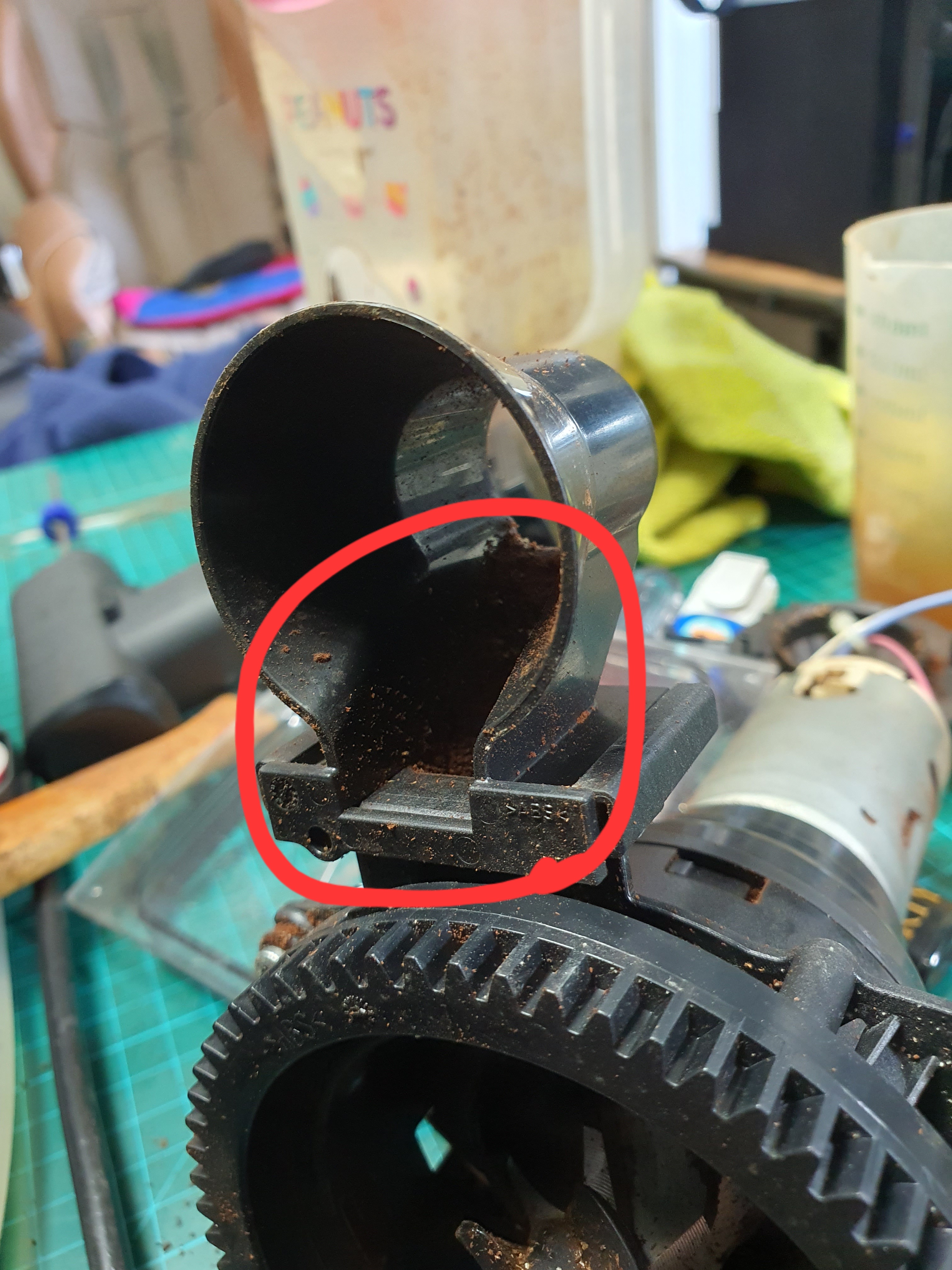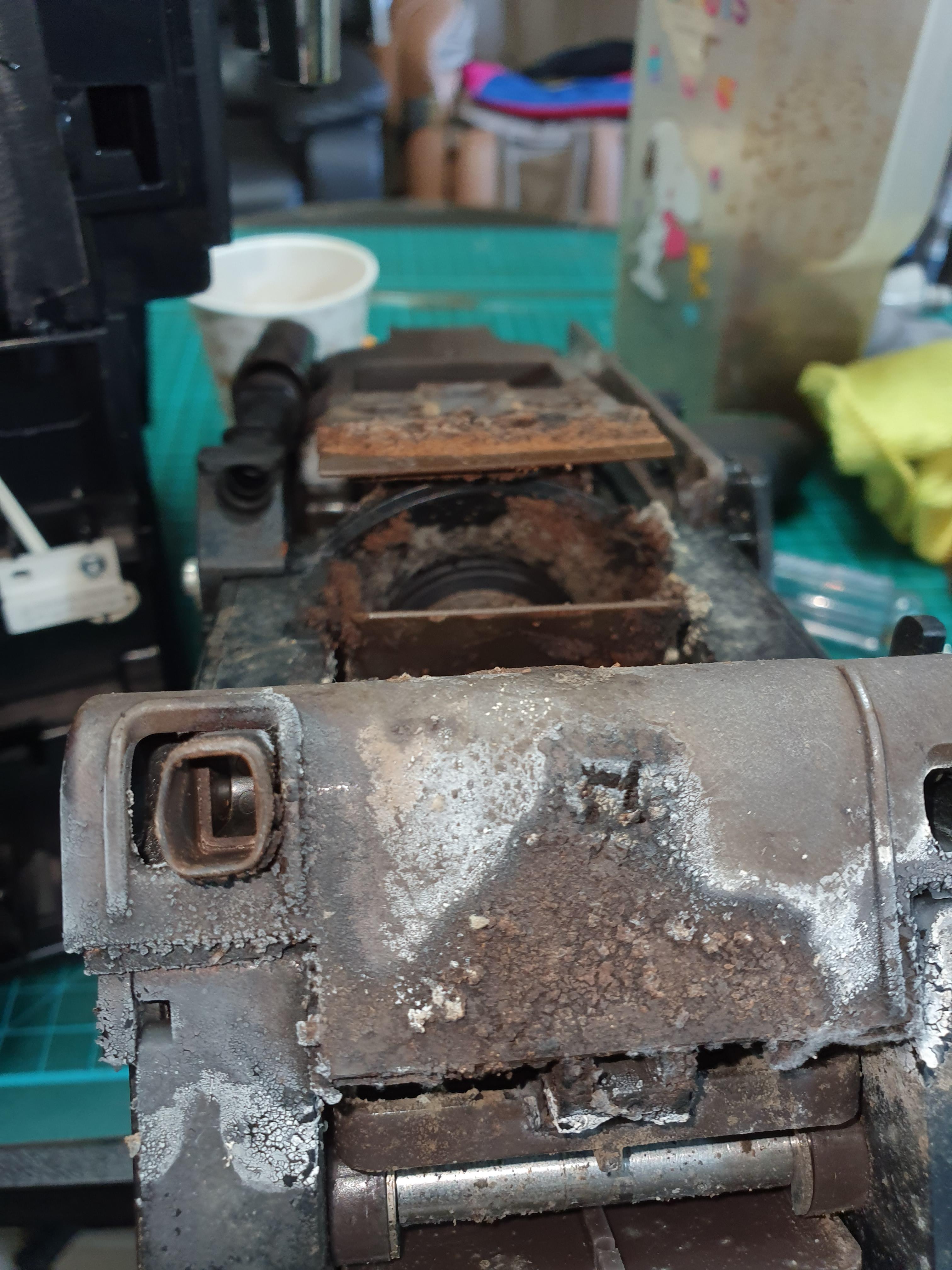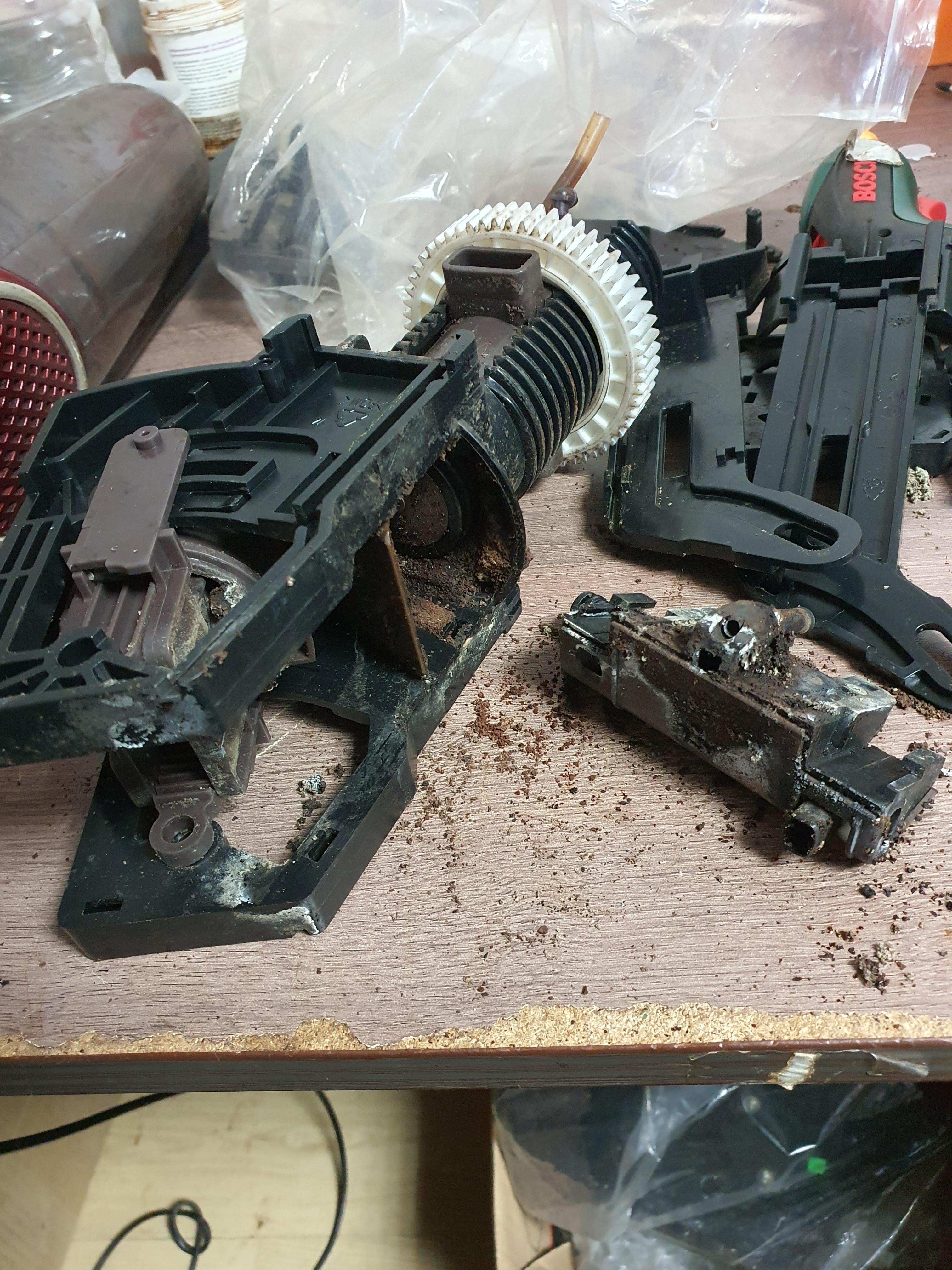 클리닝알약이 그라인더 입구쪽 원두 굳어 있는상태에서 투입된채로 위로 쌓여 올라감.이럴땐 운 나쁘면 그라인더가 위아래 잡아주는곳이 분리되는 경우도 생깁니다.